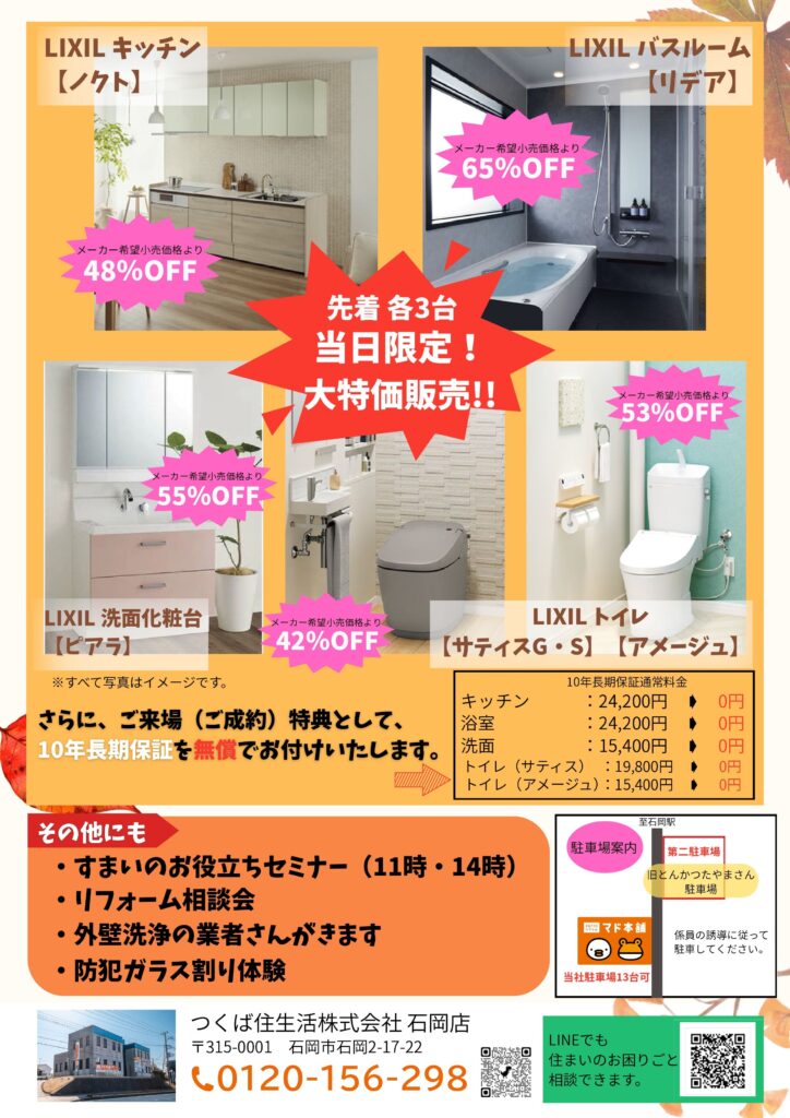 - 2025年11月8日(土) 10:00~15:30 (会場:つくば住生活株式会社 石岡店) 詳しくはこちら >