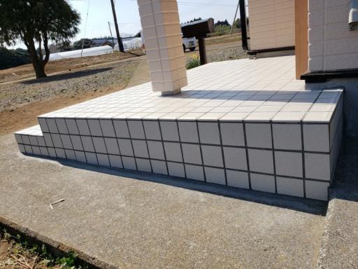 | 完成です。 写真では分かりにくいですが、階段の鼻先部分はタイルの角をとって丸みを帯びさせている「段鼻タイル」を使用しました。 このタイルを階段部分の角になるところに使うと綺麗に仕上がります! |