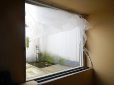 雨が入ってくるので、ビニールで応急処置してありました。 | 風が吹いたり、大雨になるとビニールではもちません。 |