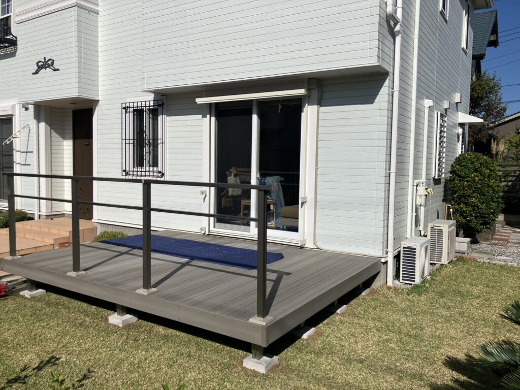 見た目は天然木のような風合いで、腐食の心配もなくメンテナンスが楽な人工木デッキ「樹ら楽ステージ木彫(LIXIL製)」をご提案させていただきました。